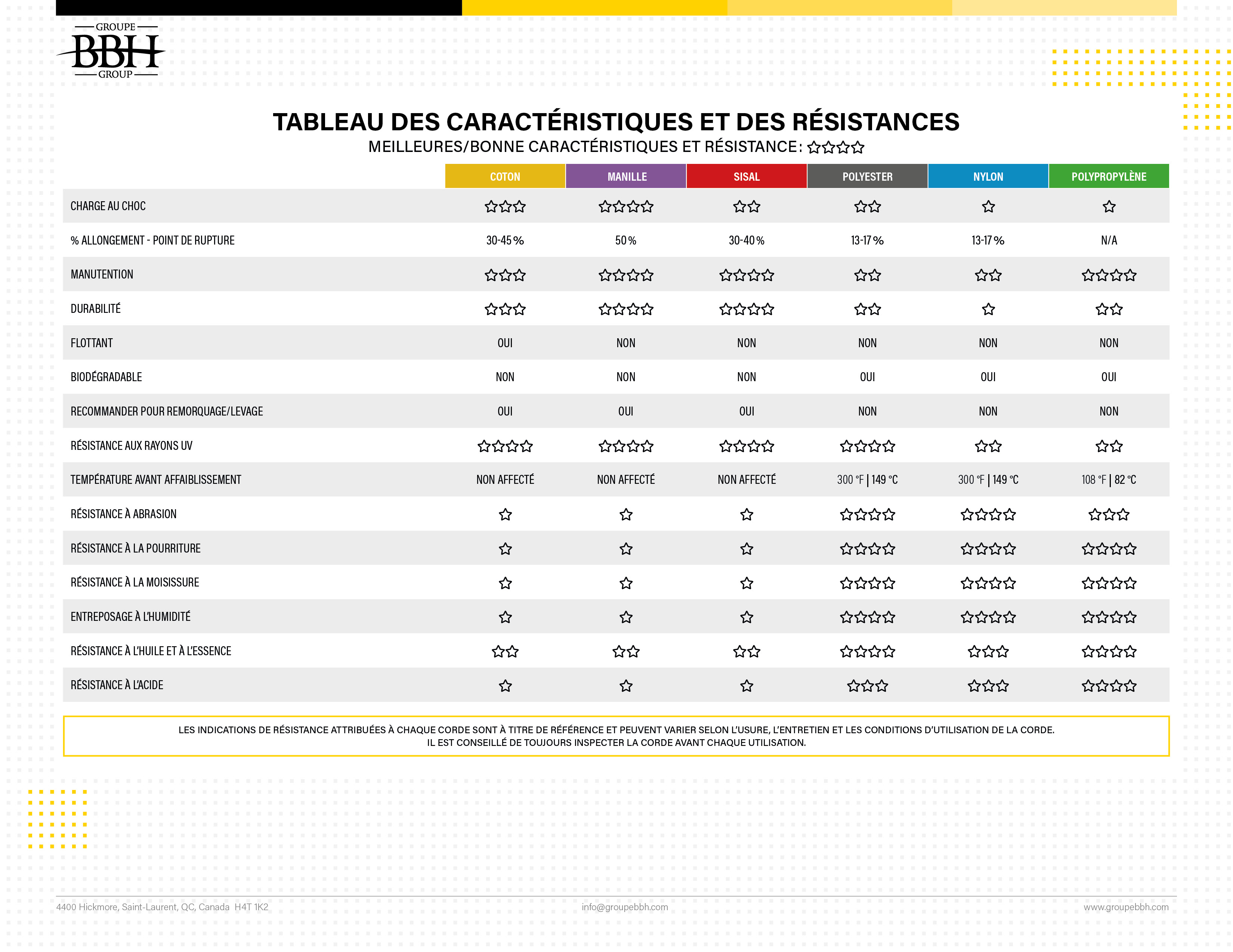 Tableau des caractéristiques et résistances